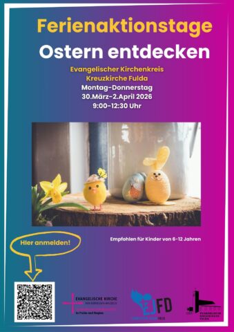 Vom 30.März bis 2. April finden in der Kreuzkirche Fulda Ferienaktionstage für Kinder im Alter von 6-12 Jahren statt. Diese stehen unter dem Motto “Ostern entdecken”.